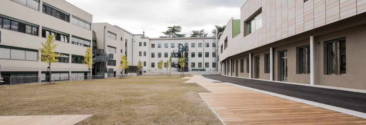 Oltre al cortile interno anche la copertura della sopraelevazione è stata realizzata con del “verde” estensivo, intervallato con dei lucernari che portano ulteriore luce naturale all’interno delle nuove aule.